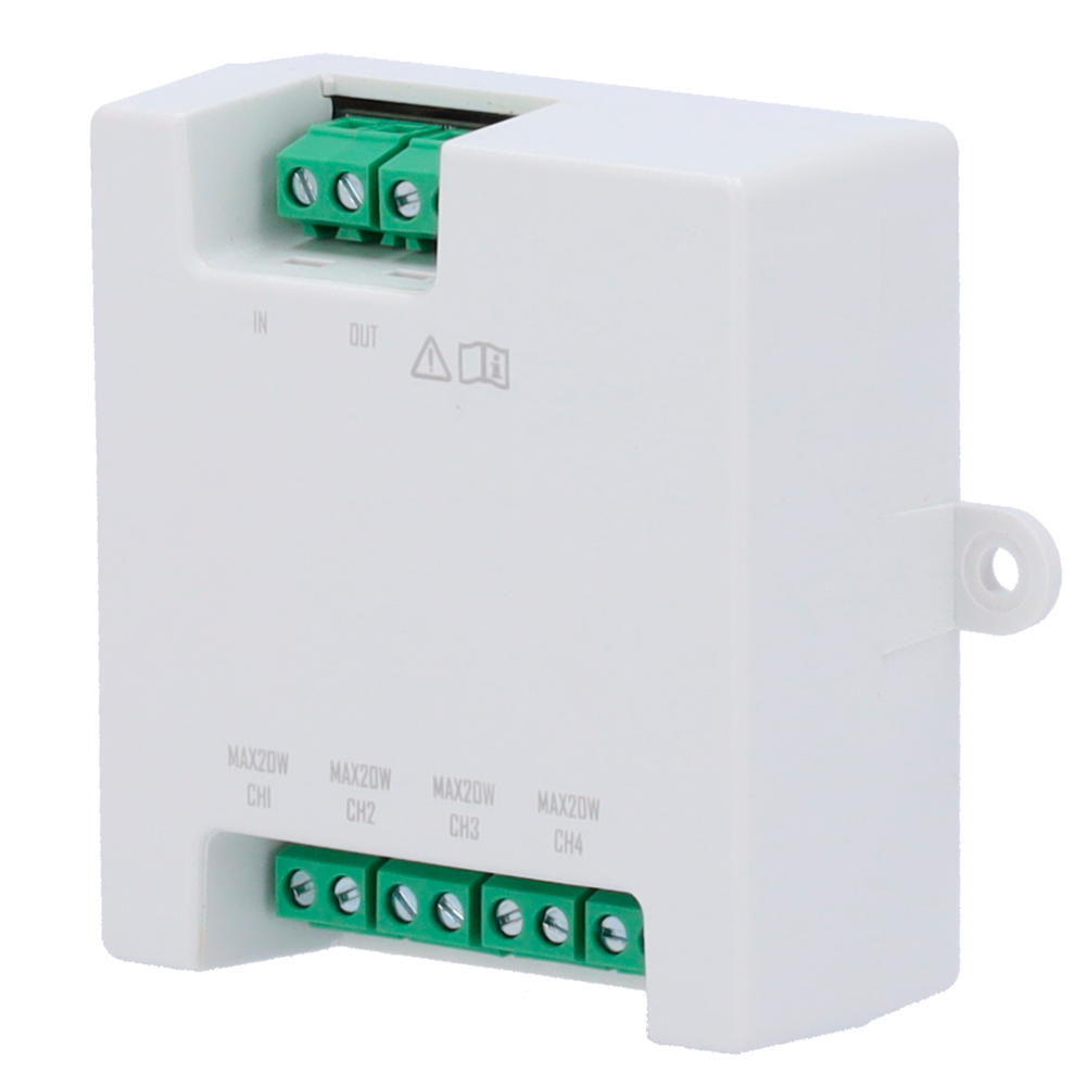 Distribuidor para edifícios – 4 grupos de 2 fios HD – Alimentação de até 4 monitores de 2 fios HD – Alimentação com DS-KAD7060EY ou DS-KAD7061EY – Hubs em cascata – Tamanho para caixa de mecanismo padrão