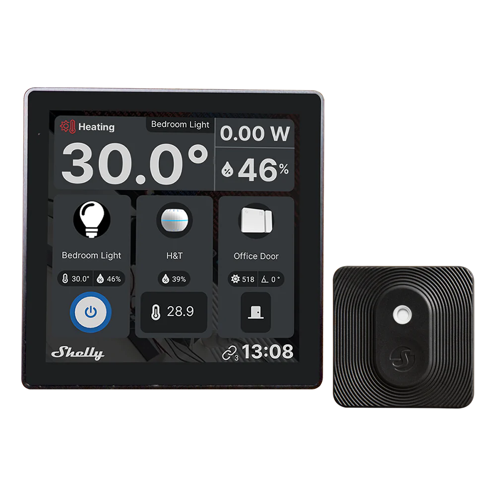 Shelly Wall Display Preto + BLU H&T Preto – WiFi 2.4 GHz / Bluetooth – Sensor H&T – Resistente à água e ao pó – Duração da bateria até 3 anos – Compatível com Alexa e Google