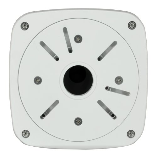 Permite alocar o alimentador, a cablagem e os acessórios da instalação no seu interior. Dispõe de múltiplos orifícios para instalação de diferentes tipos de câmaras bullet e domes. Fixação à parede ou ao tecto através de 4 parafusos incluídos. A câmara é instalada na cobertura desmontável do suporte. Permite a passagem interna dos cabos.